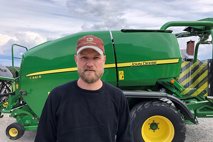 Sterk traktor: Jonas bruker en John Deere 6155R med 200 hestekrefter til å trekke pressa. Han mener traktoren og pressa er en perfekt match.