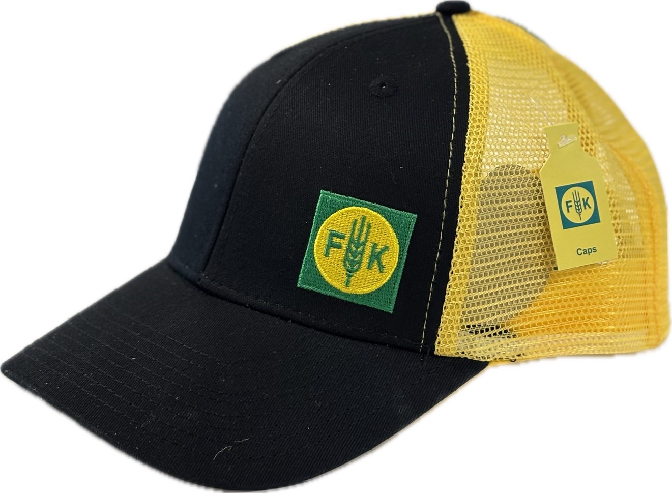 Felleskjøpet caps i fargene sort og gul med mesh bakside.