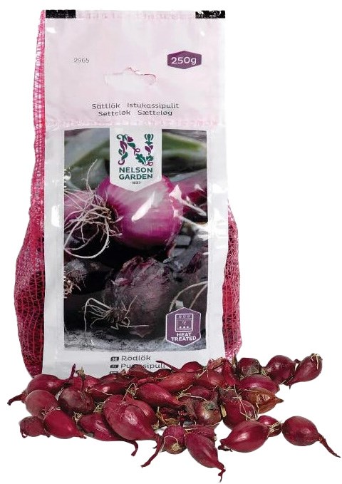 Rødløk setteløk er lettdyrket og litt mildere i smaken enn gul løk. Den passer derfor utmerket rå i f.eks. salater der den også er dekorativ. Varmebehandlet for en sikrere avling.