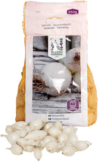 Sølvløk setteløk har et skinnende hvitt skall. Smaken er mild og aromatisk. God både rå og tilberedt. Små løk passer perfekt til sylting. Varmebehandlet for en sikrere avling.