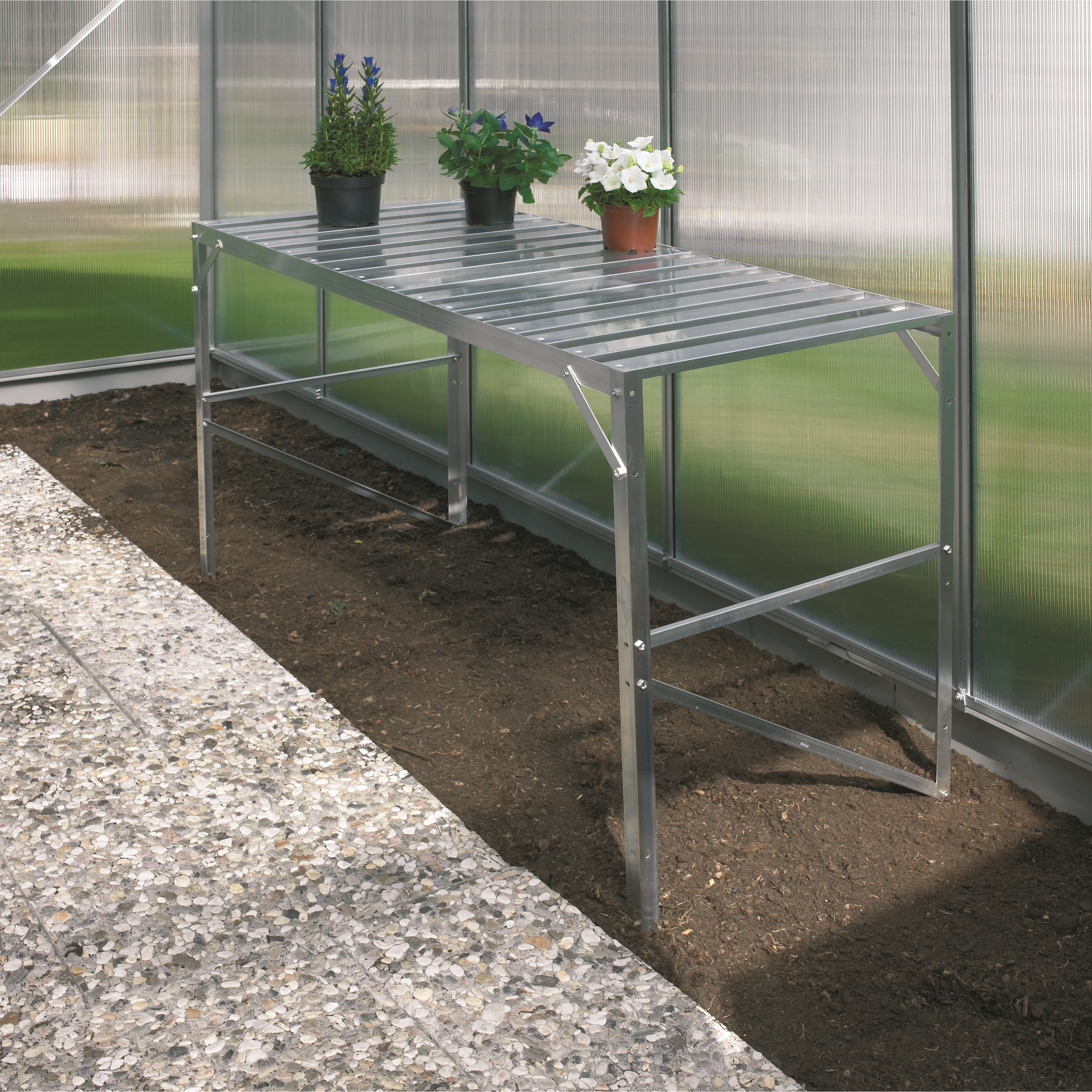 Stabilt aluminiumsbord beregnet for planter og grønnsaker. Ideelt i drivhus, boder, på balkongen. Fint for å utvide dyrkingsarealet i drivhuset.