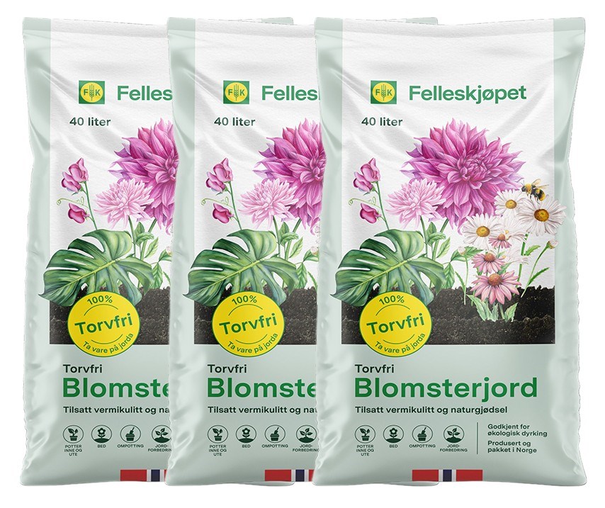 Felleskjøpets Torvfri Blomsterjord er beriket med vermikulitt, og er spesielt designet for blomster og grønne planter i potter, krukker og bed. Vermikulitt absorberer fuktighet og gjør at jorden holder seg fuktig over tid. Jorden er egnet for både innendørs og utendørs dyrking av en bred variasjon av planter, og er godkjent for økologisk produksjon.