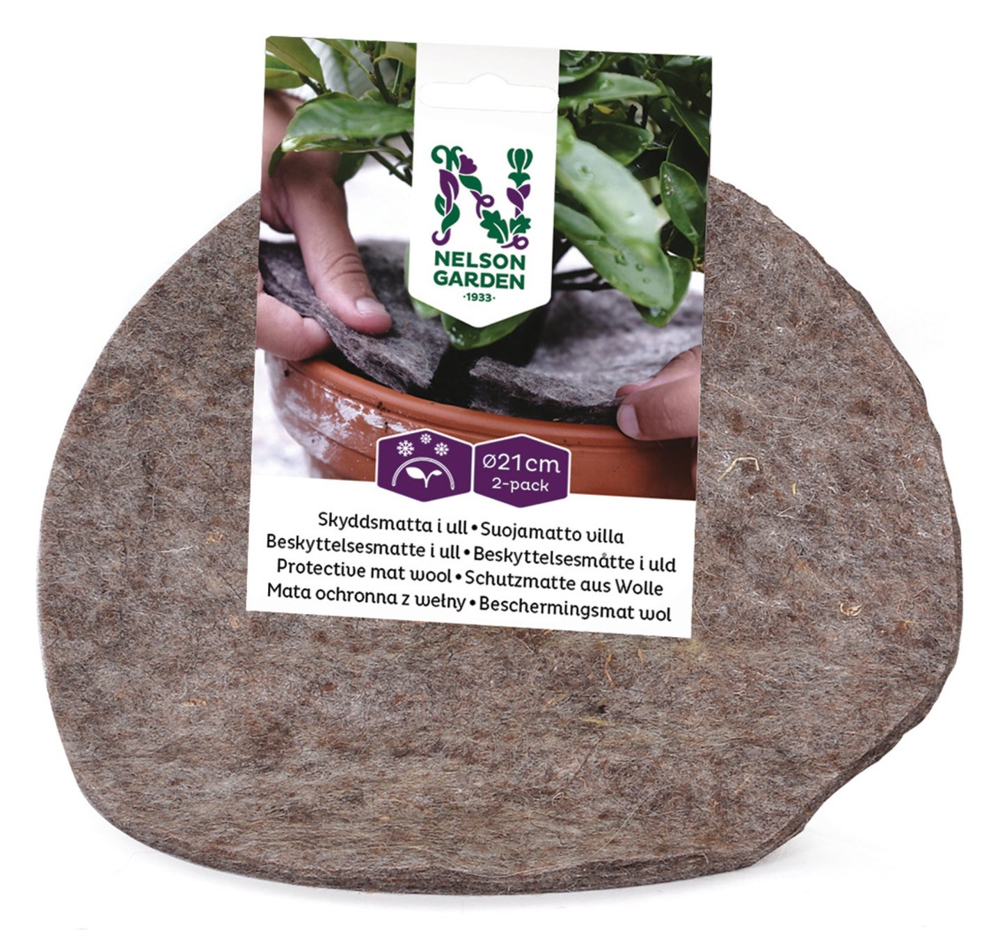 Beskyttelsesmatte i ull 2 pk, beskytter planter i potter og bed mot uttørking og ugress. Beskyttelsesmatten kan brukes som beskyttelse av planter mot kulde både ovenfra og fra bunnen i potten.