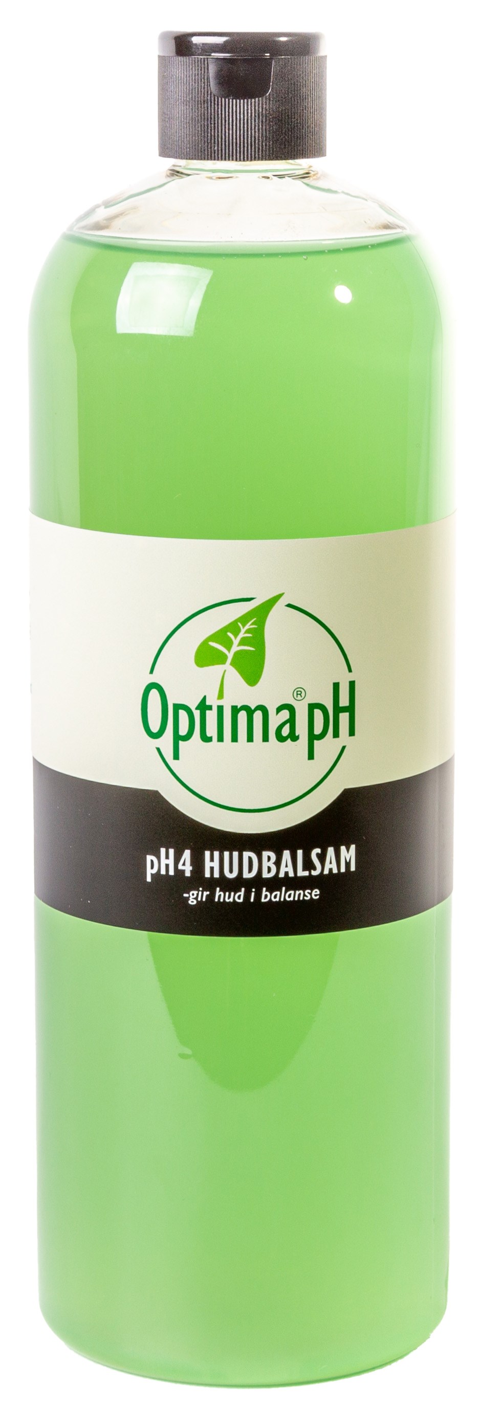 1000 ml ml refillflaske med flipptopp. Optima pH4 Hudbalsam er en mild pleiende gelé. Velegna til hudpleie av hele kroppen. Til overflatesår, kløe, hudplager og fot/hudmassasje. pH4 bevarer den gode og normale bakteriefloraen og har hemmende effekt på problembakterier.