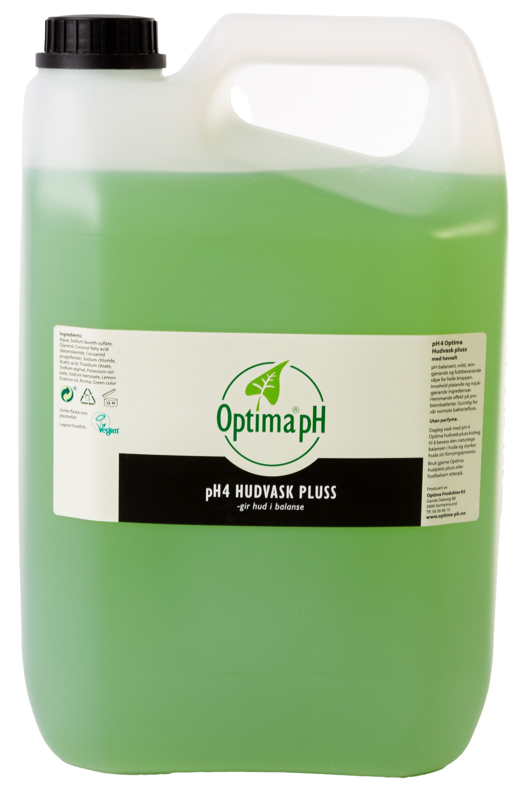 Optima pH4 Hudvask pluss 5000 ml med skrukork. Optima pH4 hudvask pluss er en mild hudvask med havsalt. Mange bruksområde. Gunstig for vår normale bakteriflora. Dette er et hudvaskemiddel som ikke fjerner fett fra huden.