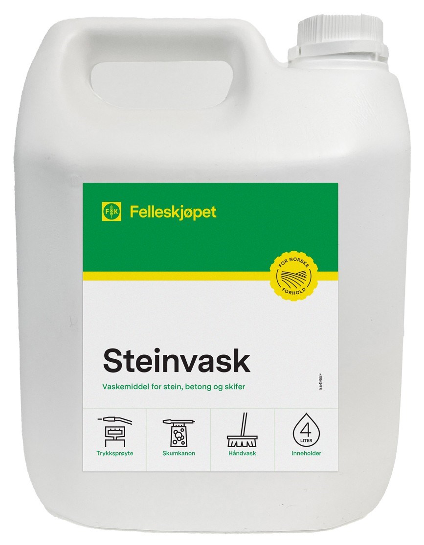 Felleskjøpet steinvask er spesielt utviklet for å fjerne smuss og skitt fra fra stein i hagen eller gårdsplassen din. Vaskemiddel er et kraftig og mattende høyalkalisk vannbasert vaskemiddel for belegningsstein, betong og skifer.