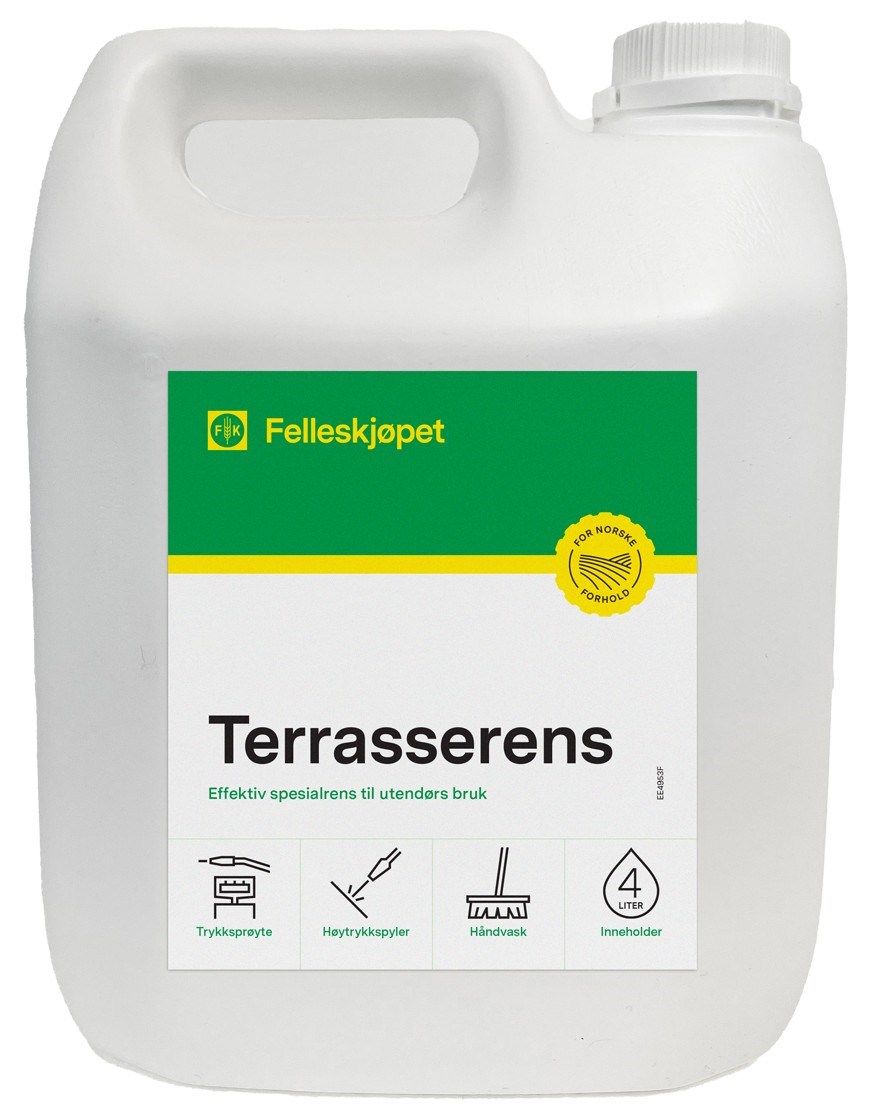 Forbered terrassen din for beising med Felleskjøpet terrasserens! Terrasserensen er et effektivt spesialprodukt som fjerner tidligere oljebehandling, fett, sot og skitt. Rengjør tre, stein og betong i dybden. Tilpasset for flater som skal males, beises eller behandles. Gir et godt og effektivt resultat slik at ny maling/beis får god heft.