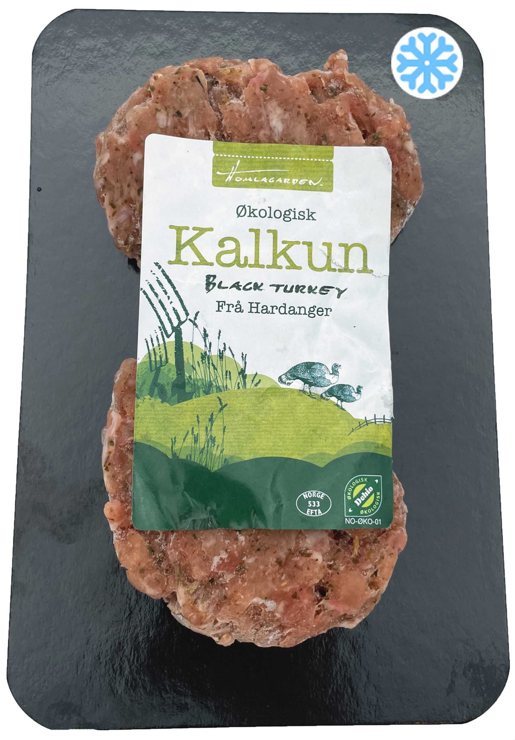 Black Turkey Burger 2-pk fra Homlagarden. Burgerene lages av lårkjøtt fra Homlagardens svarte kalkuner. Den særegne rasen Black Turkey er avlet frem hos Homlagarden, spesielt tilpasset økologisk oppdrett. Kalkunene vokser sakte og har svært fin kjøttfylde med den beste kvalitet og smak.