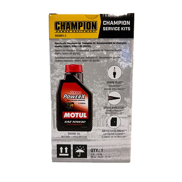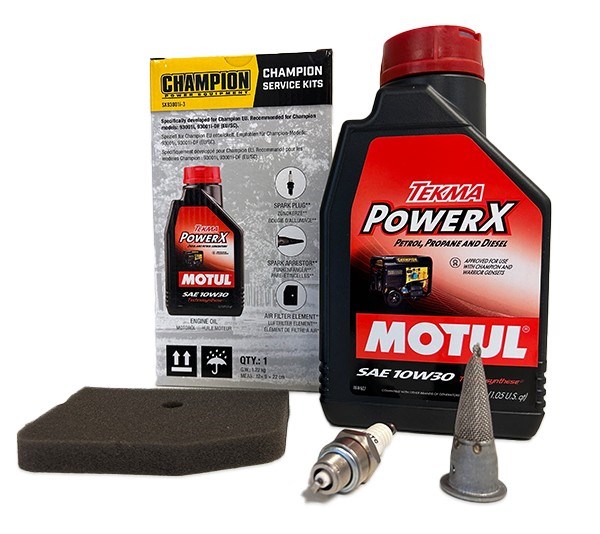 Servicekitet inneholder Champions spesialutviklede Tekma PowerX 10W30 motorolje, luftfilter, tennplugg og gnistfanger, noe som gjør det enkelt for deg å vedlikeholde ditt Champion-aggregat.