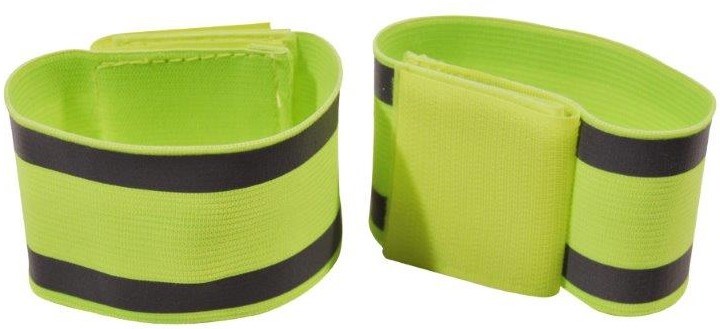 Benrefleks i gult med to grå refleksbånd. Refleksen lukkes med en kraftig borrelås.