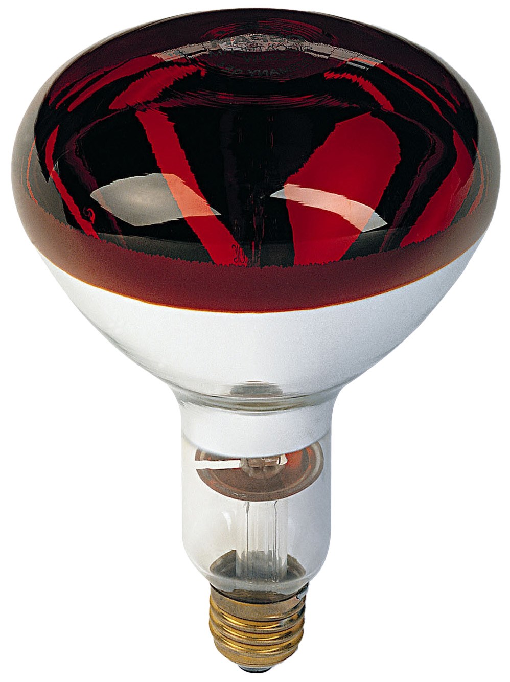 Rød med sterk varmeutvikling. Lampen må kun settes i egnede, godkjente armaturer. Lampen må beskyttes for vannsprut og fuktighet. Brukes ved oppdrett av kylling, gris, kalver, føl, m.m. 150W. Levetid 5000 timer.
