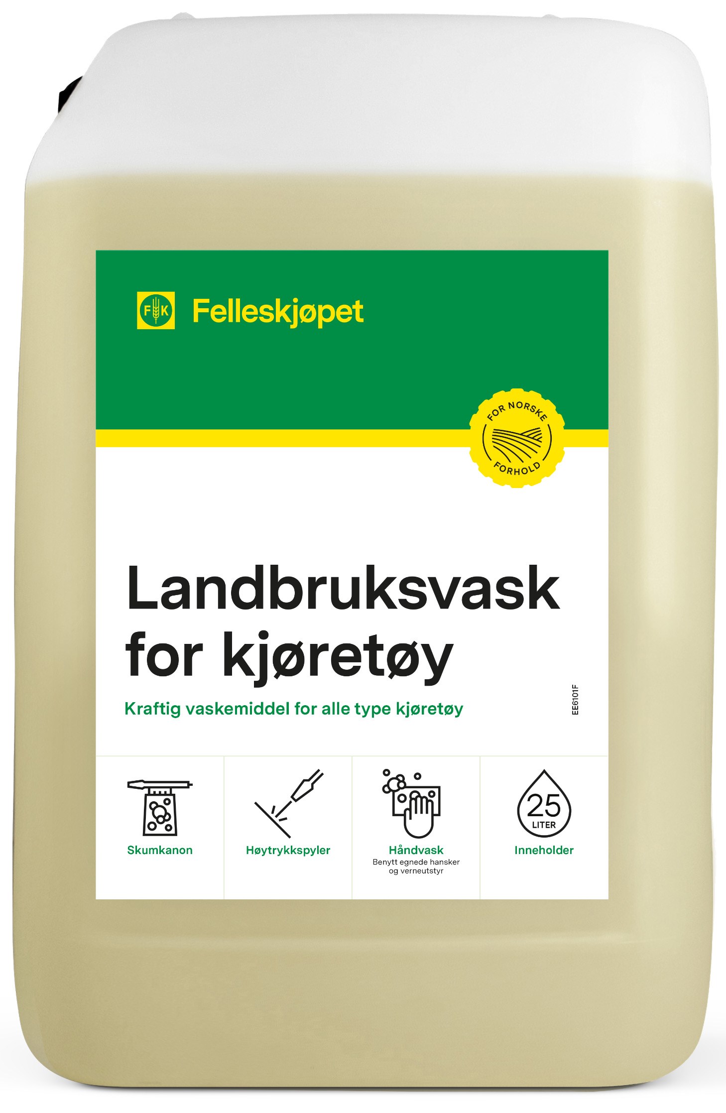 Felleskjøpet Landbruksvask for kjøretøy er et kraftig vaskemiddel for alle typer kjøretøy. Vaskemiddelet er moderat, alkalisk og fjerner raskt og enkelt smuss, fett, olje, sot, salt, veistøv og rester av sur nedbør.